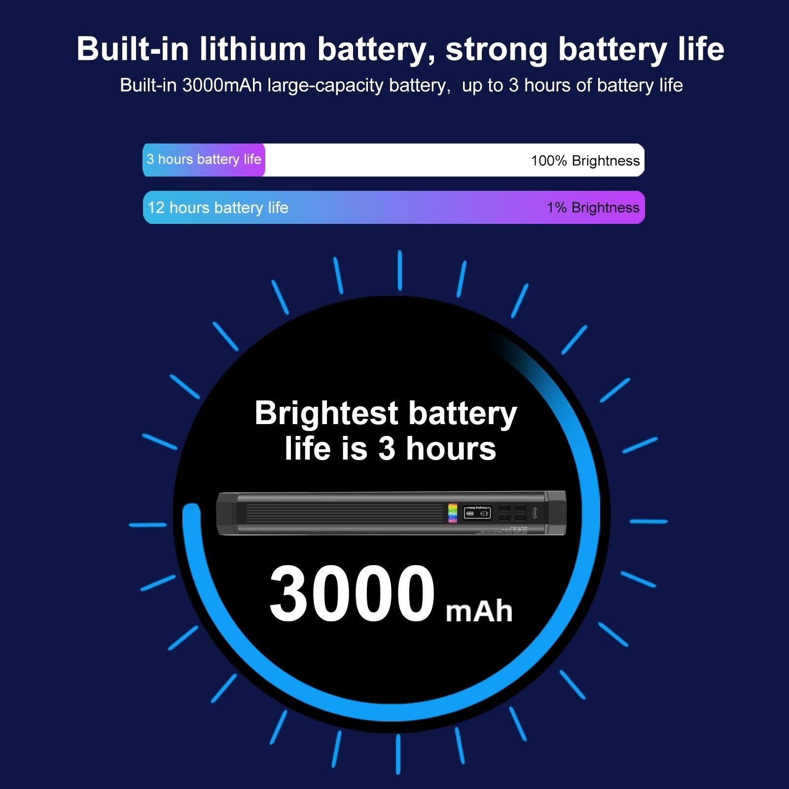 • Large 3000mAh battery for up to 3 hours of continuous use at maximum brightness