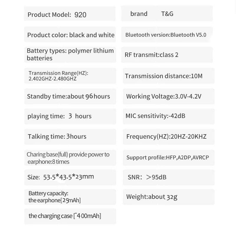 � 1 x T&G Tg920 Tws Touch Control Earbud Hi-Fi Sound Quality Clear Durable Pop-Up Wireless Bluetooth 5.0 Earphone